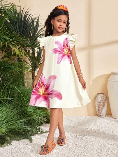 SHEIN Leap Crew 奶油色大花朵印花休闲花卉图案荷叶边袖连衣裙,适合青少年女孩,适合夏季 - 彩色 - 查看 1