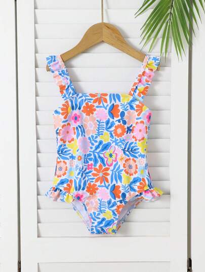 SHEIN 可爱女孩连体碎花可调节荷叶边肩带荷叶边下摆泳衣,适合泳池派对/海滩度假 - 彩色 - 查看 1