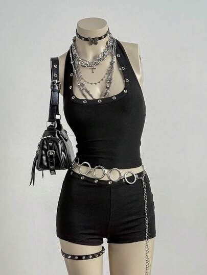 EgrlEra 女士金属孔眼吊带露脐上衣和短裤两件套 - 黑色 - 查看 1