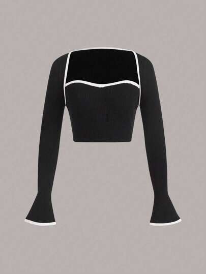 SHEIN EZwear 休閒羅紋針織 拼接細邊純色女士開襟衫 - 黑色 - 查看 1