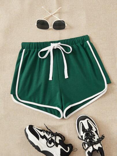 SHEIN EZwear 撞色滾邊腰部抽繩運動短褲 - 墨綠色 - 查看 1