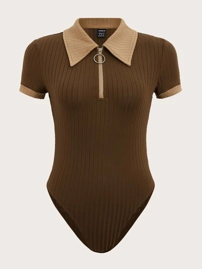 SHEIN EZwear 拼接領1/4拉鍊連身背心 - 咖啡棕 - 查看 1