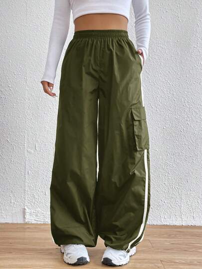 SHEIN EZwear 側拼接織帶側翻蓋口袋工裝褲 - 軍綠色 - 查看 1