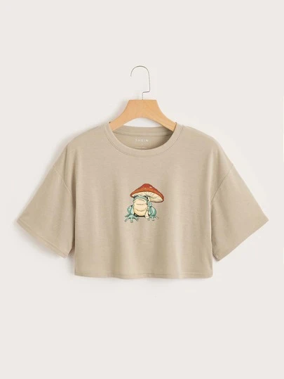 SHEIN EZwear 青蛙和蘑菇圖案短款T恤 - 杏色 - 查看 1