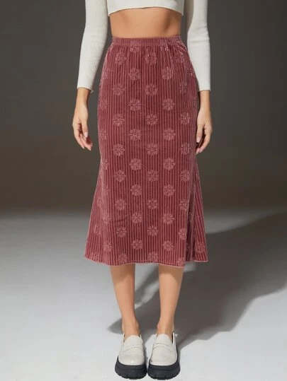 SHEIN EZwear 高腰花卉圖案提花絲絨半身裙 - 藕粉色 - 查看 1