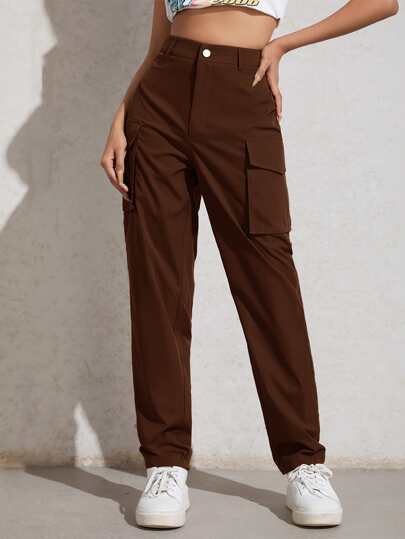 SHEIN EZwear 高腰翻蓋口袋拉鏈門襟長褲 - 巧克力棕 - 查看 1