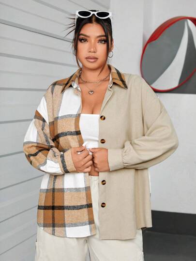 SHEIN EZwear 大碼格紋印花落肩袖外套 - 卡其色 - 查看 1