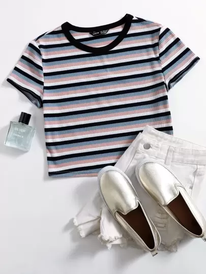 SHEIN EZwear 夏季加大罗纹针织条纹上衣 - 彩色 - 查看 1