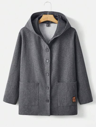 SHEIN EZwear 大碼標語拼貼細節雙口袋連帽大衣 - 深灰色 - 查看 1