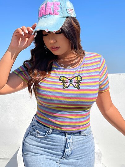 SHEIN EZwear 大碼條紋圖案和蝴蝶圖案條紋印花T恤 - 彩色 - 查看 1