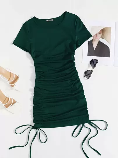 SHEIN Unity 素色側抽繩褶邊緊身連衣裙 - 墨綠色 - 查看 1