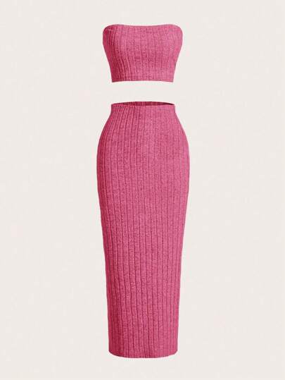 SHEIN EZwear 素色抹胸上衣&半身裙 - 玫紅色 - 查看 1