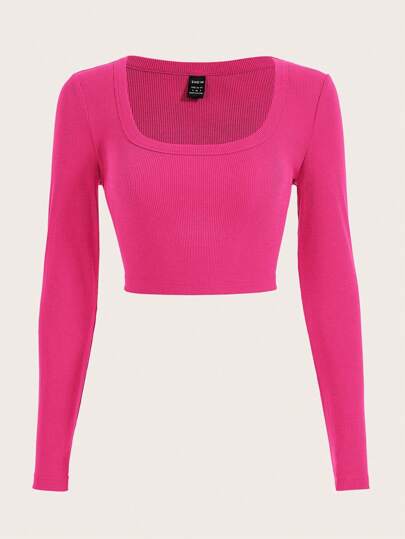 SHEIN EZwear 方領短款T恤 - 玫紅色 - 查看 1