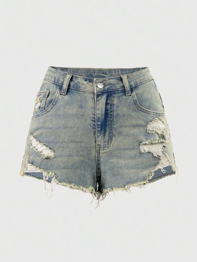 SHEIN EZwear 夏季休闲洗水破洞牛仔短裤 - 淺色水洗藍 - 查看 1
