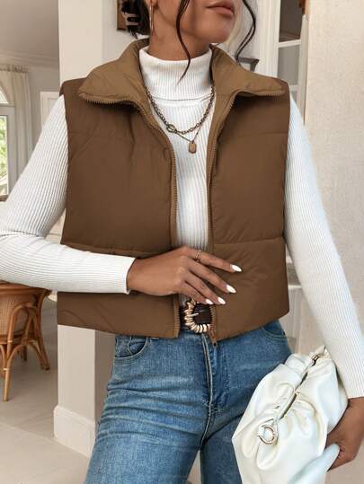 SHEIN EZwear 女式羽绒绗缝立领无袖外套,冬季,女式无袖拉链休闲保暖棉服外套,冬季女式外套,黑色夹克,冬季女装,黑色外套,复古,优雅女士,节日服装,商务休闲女士, - 鏽棕色 - 查看 6
