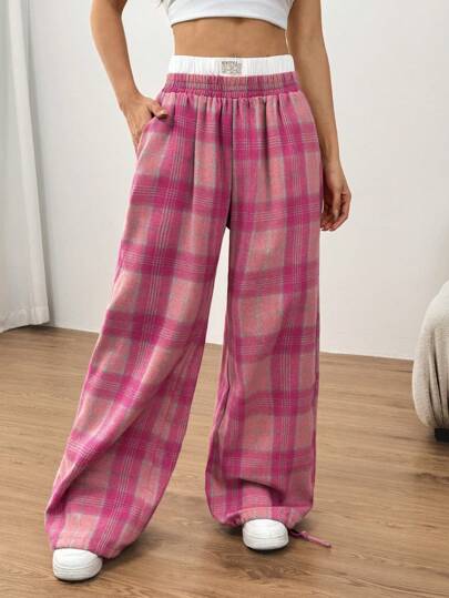 SHEIN EZwear 女式简约松紧腰格子拼布裤,秋冬 - 彩色 - 查看 1