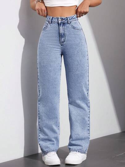 SHEIN EZwear 女式帶口袋直筒牛仔褲 - 藍色 - 查看 1
