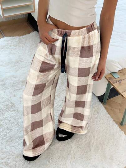 SHEIN EZwear 女式系腰蓬松格子印花休闲阔腿宽松裤 - 棕色 - 查看 1