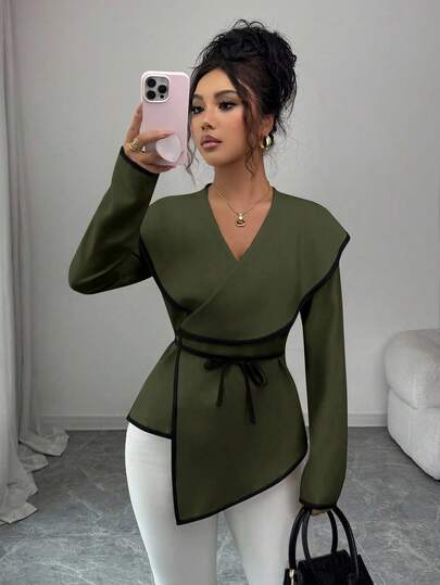 Elenzga 女式交叉V领长袖修身收腰撞色拼接优雅衬衫