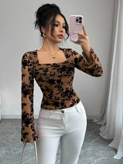 SHEIN Elenzya 女士花卉植绒网眼方领长袖优雅T恤,春季款