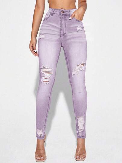 SHEIN Essnce 休闲洗水做旧修身牛仔裤 - 紫色 - 查看 1