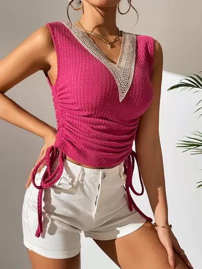 Chiquease 拼接水溶蕾絲側抽繩背心上衣 - 玫紅色 - 查看 1