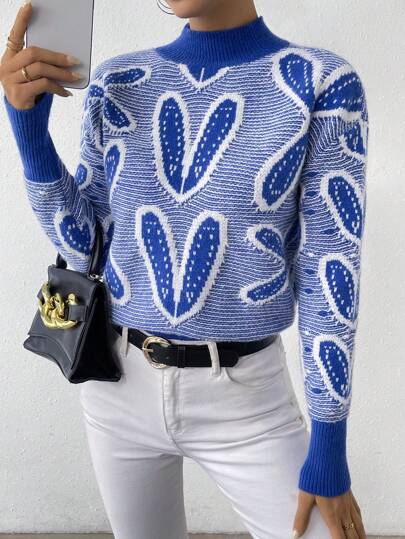 SHEIN Essnce 心形图案落肩针织套头衫秋冬毛衣 - 彩色 - 查看 1