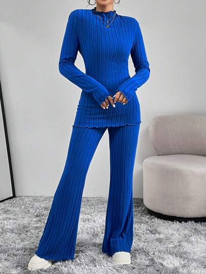 SHEIN Essnce 小高領下擺開叉T恤&喇叭褲 - 寶藍色 - 查看 1
