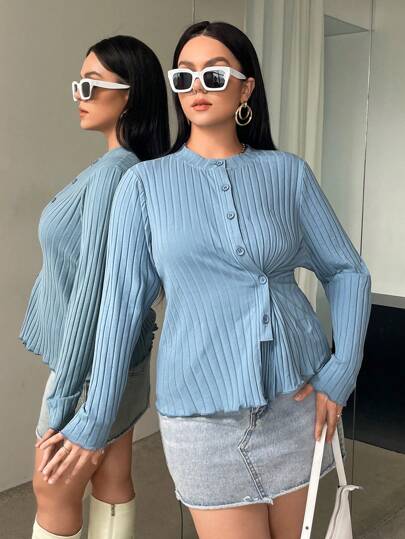 SHEIN Essnce 大碼木耳邊前紐扣T恤 - 藍色 - 查看 1