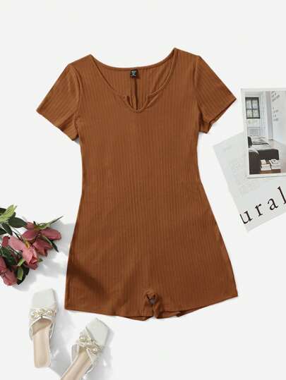 SHEIN Essnce 大碼缺口領條紋針織連身短褲 - 棕色 - 查看 1
