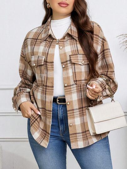 SHEIN Essnce 休閒格子大碼夾克 - 米色 - 查看 1