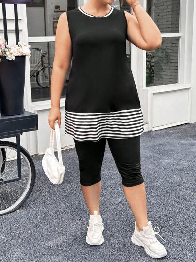 SHEIN Essnce 大码条纹拼接长款背心和纯色打底裤两件套 - 黑與白 - 查看 1