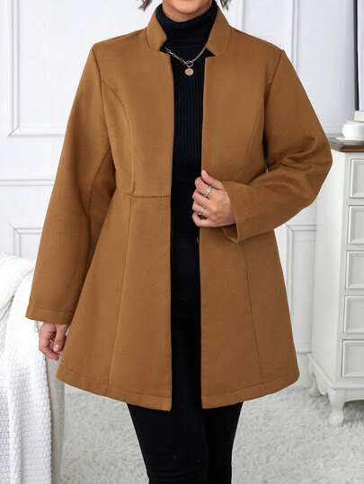 Calvaya 大碼素色開門襟花呢外套 - 棕色 - 查看 1