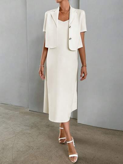 SHEIN Essnce 素色吊帶連衣裙&單排釦西裝外套 - 杏色 - 查看 1