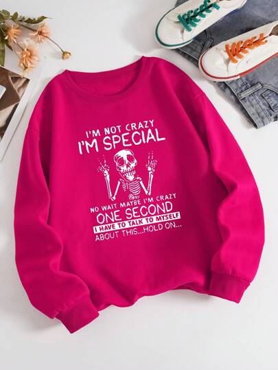 SHEIN Essnce 女式落肩骷髏印花標語衛衣 - 玫紅色 - 查看 1