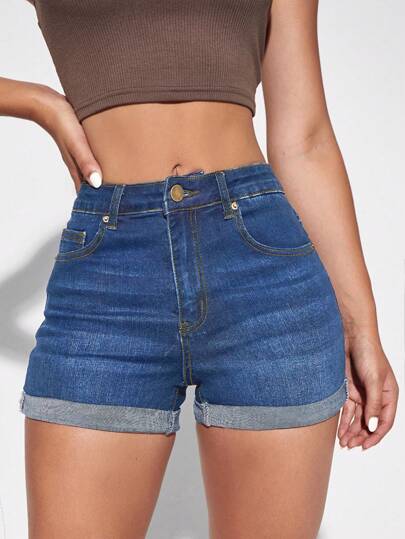 SHEIN Essnce 女士休闲口袋下摆卷边牛仔短裤 - 中等水洗藍 - 查看 1