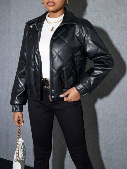 SHEIN Essnce 女式冬季纯色 PU 皮革前拉链短款休闲加厚外套