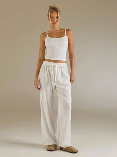 SHEIN Forever 21 休闲度假宽松绿色吊带上衣和裤子套装 - 白色 - 查看 1