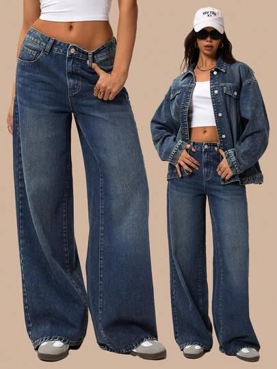 SHEIN Forever 21 女式休闲宽松口袋牛仔裤 - 藏蓝色 - 查看 1