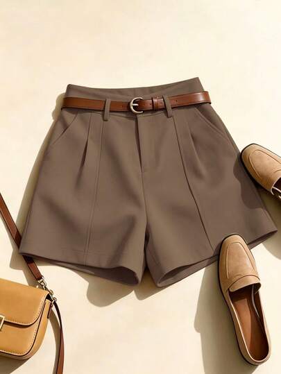SHEIN Franclia 法式极简时尚梭织纯色通勤休闲复古高腰A字阔腿新款女式短裤
