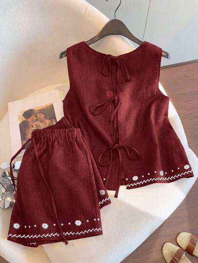 SHEIN Franclia 女士休闲度假套装,圆领露背扎染印花上衣搭配扎染短裤,春夏款