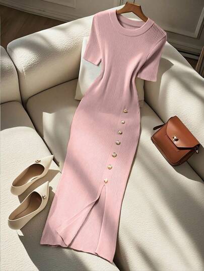 SHEIN Franclia 女式短袖优雅修身圆领装饰纽扣针织连衣裙
