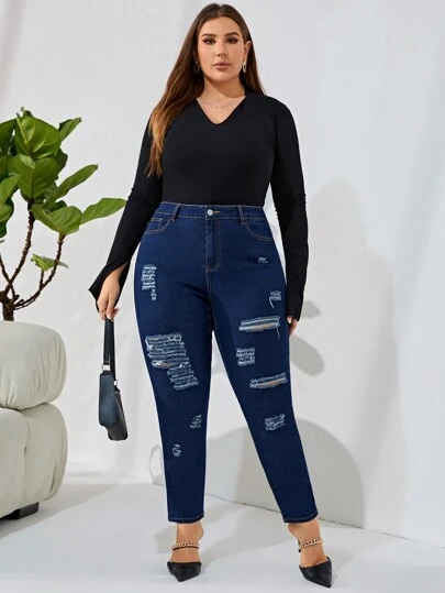 SHEIN Frenchy 大碼破洞緊身牛仔褲 - 深色水洗藍 - 查看 1