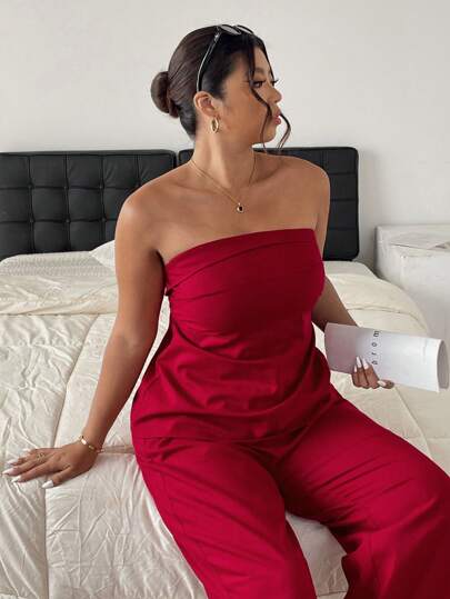 SHEIN Frenchy 加大码纯色吊带背心和长裤两件套 - 紅色 - 查看 1