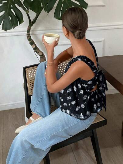 SHEIN Frenchy 女士度假印花编织提花后系带荷叶边下摆背心,夏季度假露背欧洲夏季露背上衣,碎花图案狂欢上衣狂欢伊比沙岛海滩可爱外出上衣生日度假