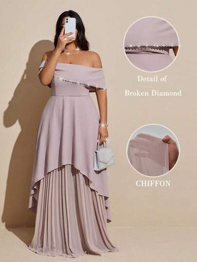 SHEIN Galaire 大码女式优雅奢华派对礼服,露肩,水钻装饰,雪纺褶皱长裙