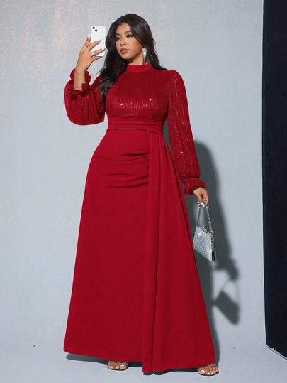 Viva Relle 大码女士优雅亮片装饰长袖收腰连衣裙,适合宴会、派对、婚礼宾客、新年、圣诞节等场合。