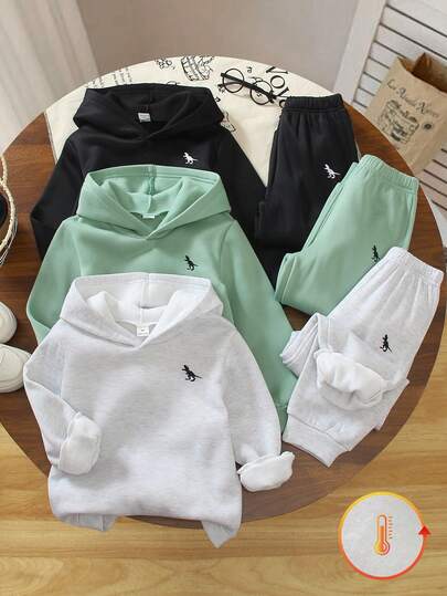 SHEIN Genkimix Kids 3 件套幼儿男童休闲恐龙刺绣连帽运动衫和宽松裤子套装,优质柔软面料,时尚百搭设计,适合上学、郊游、度假、派对、返校季