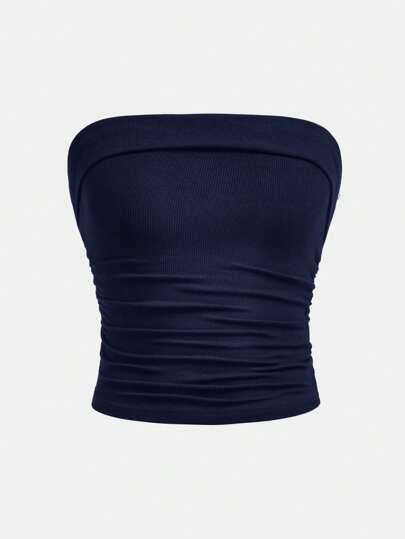 SHEIN Girlism 少女褶饰腰部针织短款抹胸无肩带抹胸上衣 - 藏蓝色 - 查看 1