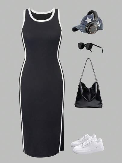 SHEIN 女童休闲百搭日常通勤女士黑白撞色滚边短款针织连衣裙,可搭配母女装和姐妹装 - 黑色 - 查看 1